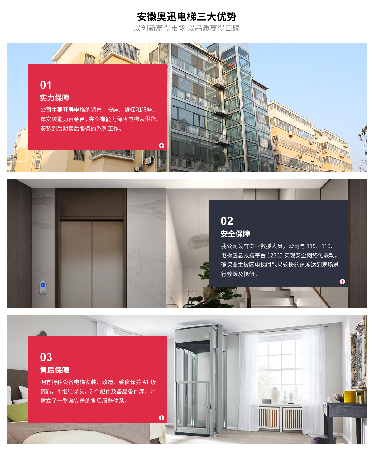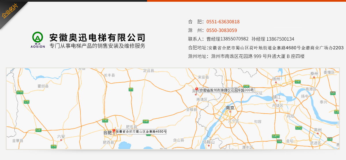 安徽奧迅電梯有限公司是一家專門從事電梯產品銷售、安裝、維修、保養、舊梯改造一體化運營,零配件銷售及與電梯相關技術咨詢、培訓的專業有限公司。公司成立于2015年6月,注冊資本1020萬元人民幣。 我公司具有安徽省質量技術監督局頒發的關于特種設...